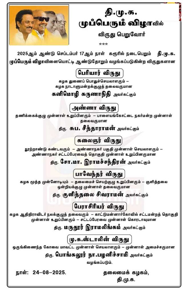 அதன்படி, , 2025ஆம் ஆண்டுக்கான முப்பெரும் விழா, கரூர் மாவட்டத்தில் வருகிற செப்டம்பர் 17ஆம் நாள் நடைபெற இருக்கிறது. இதை தி.மு.க தலைமைக் கழகம் அதிகாரப்பூர்வமாக அறிவித்துள்ளது. திமு கழகத்தின் சார்பில் நடப்பாண்டில் முப்பெரும் விழாவின் விருதுக்கு தேர்வு செய்யப்பட்டவர்கள் விவரங்களையும் தி.மு.க தலைமைக் கழகம் அறிவித்துள்ளது.