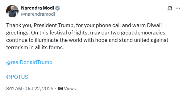 இதுகுறித்து மோடி இன்று தனது எக்ஸ் பக்கத்தில் குறிப்பிட்டுள்ளதாவது, “ஜனாதிபதி டிரம்ப், உங்கள் தொலைபேசி அழைப்புக்கும் அன்பான தீபாவளி வாழ்த்துக்களுக்கும் நன்றி” என்று பதிவிட்டுள்ளார்.