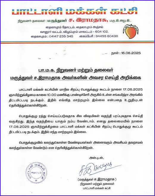 இதுபற்றி அவர் வெளியிட்டுள்ள அறிக்கையில், “பாட்டாளி மக்கள் கட்சியின் மாநில சிறப்பு பொதுக்குழு கூட்டம் நாளை 17.08.2025 ஞாயிற்றுக்கிழமை காலை 10 மணிக்கு பாண்டிச்சேரி அருகில் உள்ள சங்கமித்ரா அரங்கில் திட்டமிட்டபடி நடக்கும். இதில் எவ்வித மாற்றமும் இல்லை என்பதை உறுதியுடன் தெரிவித்துக்கொள்கிறேன். பொதுக்குழு ரத்து செய்யப்படுவதாக சில விஷமிகள் வதந்தி பரப்புவதாக செய்தி வருகிறது. இந்த வதந்தியை யாரும் நம்ப வேண்டாம். எனது தலைமையில் நாளை 17.08.2025 ஞாயிற்றுக்கிழமை பாட்டாளி மக்கள் கட்சியின் சிறப்பு பொதுக்குழு கூட்டம் திட்டமிட்டபடி நடக்கும். இதில் எந்த மாற்றமும் இல்லை. பொதுக்குழுவில் கலந்துகொள்ள வேண்டியவர்கள் அனைவரும் அவசியம் தவறாமல் கலந்துகொள்ள வேண்டும் என தெரிவித்துக்கொள்கிறேன்” என்று தெரிவித்துள்ளார்.