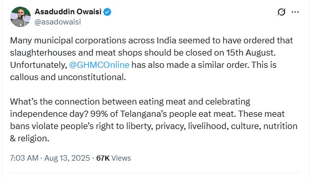 இந்த நடவடிக்கை அரசியலமைப்பிற்கு விரோதமானது மற்றும் அடிப்படை உரிமைகளை மீறுவதாக உள்ளது என பதிவிட்டுள்ள ஒவைசி, தேசிய பெருமையை உணவு கட்டுப்பாடுகளுடன் தொடர்புபடுத்துவதை விமர்சித்துள்ளார்.