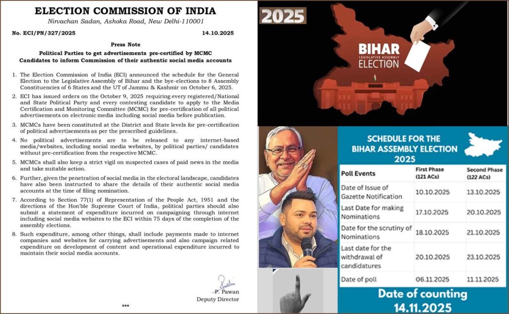 பாட்னா: பீகார் சட்டமன்ற தேர்தலை முன்னிட்டு,  அரசியல் கட்சிகளின் தேர்தல் விளம்பரங்களுக்கு  இந்திய தேர்தல் ஆணையம் கடும் கட்டுப்பாடுகளை அறிவித்து உள்ளது. மேலும், அவர்களின் விளம்பரங்களுக்கு அனுமதி பெற வேண்டும் என உத்தரவிட்டுள்ளது.