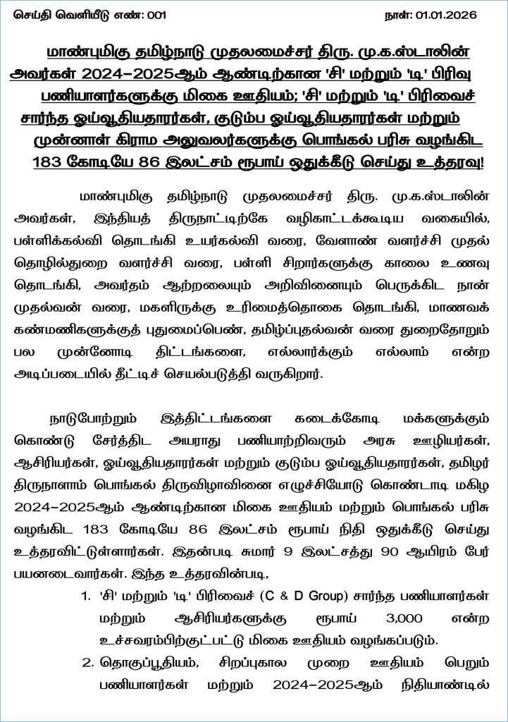 தமிழ்நாடு முதலமைச்சர் ஸ்டாலின், 2024-2025ஆம் ஆண்டிற்கான ‘சி’ மற்றும் ‘டி’ பிரிவு பணியாளர்களுக்கு மிகை ஊதியம்; ‘சி’ மற்றும் ‘டி’ பிரிவைச் சார்ந்த ஓய்வூதியதாரர்கள், குடும்ப ஓய்வூதியதாரர்கள் மற்றும் முன்னாள் கிராம அலுவலர்களுக்கு பொங்கல் பரிசு வழங்கிட 183 கோடியே 86 இலட்சம் ரூபாய் ஒதுக்கீடு செய்து உத்தரவிட்டுள்ளது.