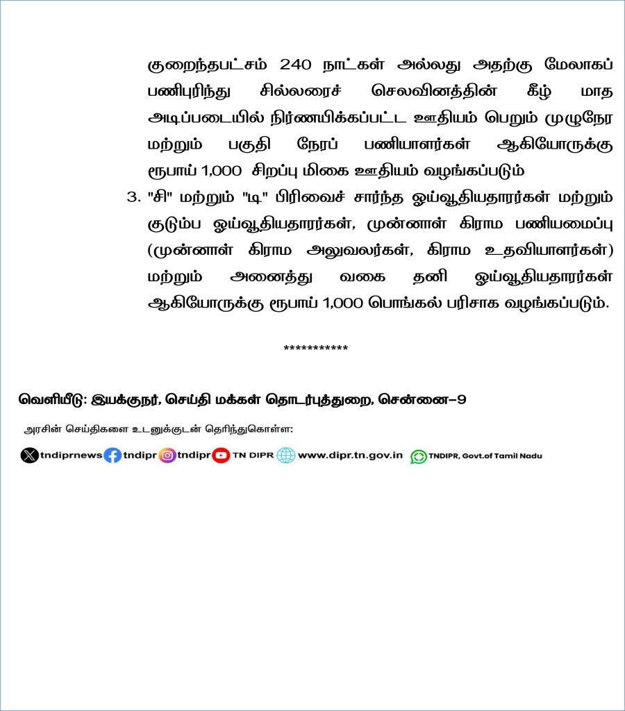 தொகுப்பூதியம், சிறப்புகால முறை ஊதியம் பெறும் பணியாளர்கள் மற்றும் 2024-2025 ஆம் நிதியாண்டில் குறைந்தபட்சம் 240 நாட்கள் அல்லது அதற்கு மேலாகப் பணிபுரிந்து சில்லரைச் செலவினத்தின் கீழ் மாத அடிப்படையில் நிர்ணயிக்கப்பட்ட ஊதியம் பெறும் முழுநேர மற்றும் பகுதி நேரப் பணியாளர்கள் ஆகியோருக்கு ரூபாய் 1,000 சிறப்பு மிகை ஊதியம் வழங்கப்படும் “சி” மற்றும் “டி” பிரிவைச் சார்ந்த ஓய்வூதியதாரர்கள் மற்றும் குடும்ப ஓய்வூதியதாரர்கள், முன்னாள் கிராம பணியமைப்பு (முன்னாள் கிராம அலுவலர்கள், கிராம உதவியாளர்கள்) மற்றும் அனைத்து வகை தனி ஓய்வூதியதாரர்கள் ஆகியோருக்கு ரூபாய் 1,000 பொங்கல் பரிசாக வழங்கப்படும் என்று தெரிவிக்கப்பட்டு உள்ளது.