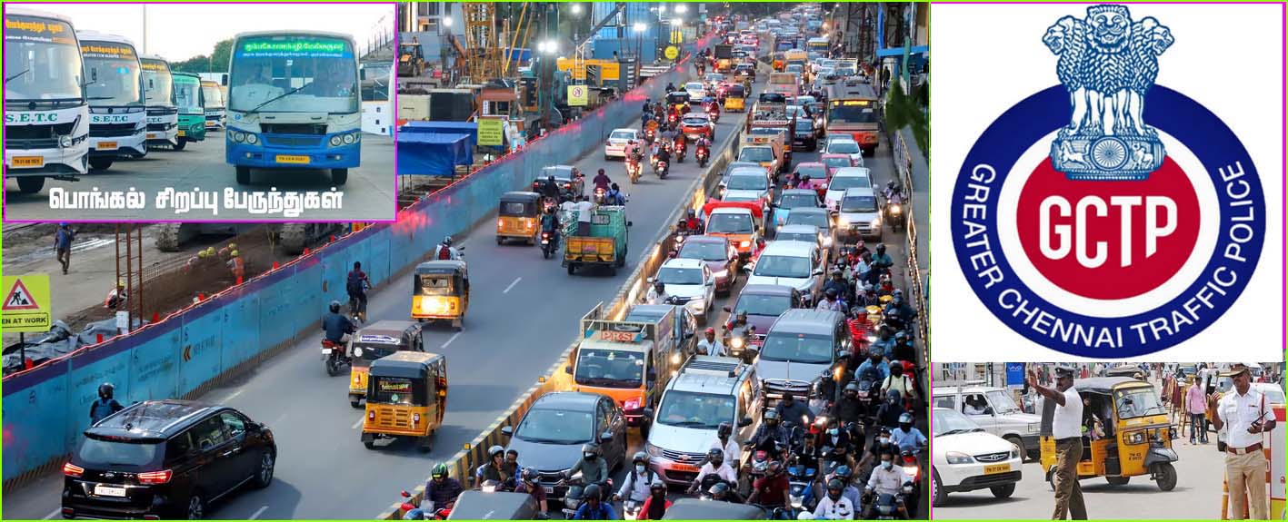 சென்னையில் இருந்து சொந்த வாகனங்களில் வெளியூர் செல்வோர்கள் நகரத்துக்குள் வராமல் புறவழிச் சாலைகளைப் பயன்படுத்த அறிவுறுத்தப்பட்டுள்ளது. பொங்கல் பண்டிகையையொட்டி, சென்னையில் இருந்து லட்சக்கணக்கான மக்கள் இன்றுமுதல் பேருந்து, ரயில், கார்கள் மூலம் சொந்த ஊர்களுக்கு செல்லத் தொடங்கியுள்ளனர். சென்னை கிளாம்பாக்கம், கோயம்பேடு, மாதவரம் உள்ளிட்ட பேருந்து முனையங்களில் இருந்து கூடுதல் அரசுப் பேருந்துகளும், மாநகர இணைப்புப் பேருந்துகளும் இயக்கப்பட்டு வருகின்றது.