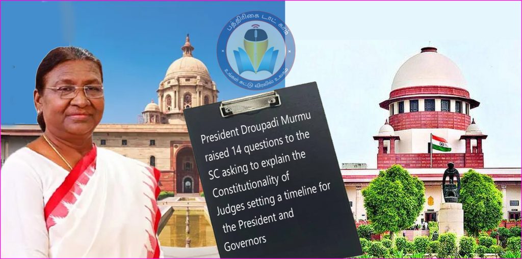 ஜனாதிபதி மற்றும் ஆளுநர்களுக்கான காலக்கெடுவை நீதிபதிகள் நிர்ணயிப்பதன் அரசியலமைப்புச் சட்டத்தை விளக்குமாறு ஜனாதிபதி திரௌபதி முர்மு உச்ச நீதி மன்றத்திடம் 14 கேள்விகளை எழுப்பினார். இந்தக் கேள்விகளுடன், நிர்வாக மற்றும் நீதித்துறை அதிகாரத்தின் அரசியலமைப்பு எல்லைகள் குறித்து ஜனாதிபதி தெளிவுபடுத்த முயல்கிறார், இது தேசிய முக்கியத்துவம் வாய்ந்த விஷயங்களில் நீதித்துறை விளக்கத்தின் அவசியத்தை வலுப்படுத்துகிறது. ஜனாதிபதியின் குறிப்புக்கு பதிலளிக்க உச்ச நீதிமன்றம் இப்போது ஒரு அரசியலமைப்பு பெஞ்சை அமைக்க வேண்டும் என்ற நிலை உருவாகி உள்ளது. மேலும், இந்த கேள்வியால், உச்சநீதிமன்றத்தின் தீர்ப்பும் கேள்விக்குறியாகி உள்ளது. இது பரபரப்பை ஏற்படுத்தி உள்ளது.