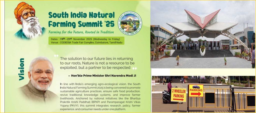 தமிழ்நாட்டில் உள்ள விவசாயிகள் சங்கங்களால் கோவையில் நடத்தப்படும் 25வது தென்னிந்திய இயற்கை வேளாண்மை உச்சி மாநாட்டில் உரையாற்றுவதற்காக பிரதமர் நரேந்திர மோடி நவம்பர் 19 ஆம் தேதி கோவைக்கு வருகை தருகிறார். இது இயற்கை வேளாண் நிபுணர் மறைந்த ஜி. நம்மாழ்வார் பரப்பிய விவசாய முறைகளை முன்னெடுத்துச் செல்லும் என்று நம்பப்படுகிறது.