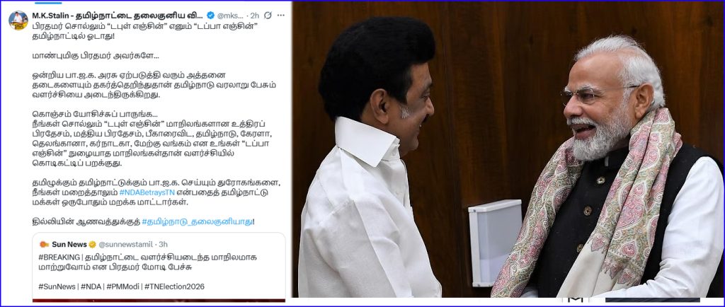 இதை விமர்சித்து முதல்வர் ஸ்டாலின் தனது எக்ஸ் தளத்தில் வெளியிட்டுள்ள பதிவில், பிரதமர் சொல்லும் “டபுள் என்ஜின்” எனும் “டப்பா என்ஜின்” தமிழ்நாட்டில் ஓடாது! பிரதமர் அவர்களே… மத்திய பா.ஜ.க. அரசு ஏற்படுத்தி வரும் அத்தனை தடைகளையும் தகர்த்தெறிந்துதான் தமிழ்நாடு வரலாறு பேசும் வளர்ச்சியை அடைந்திருக்கிறது.