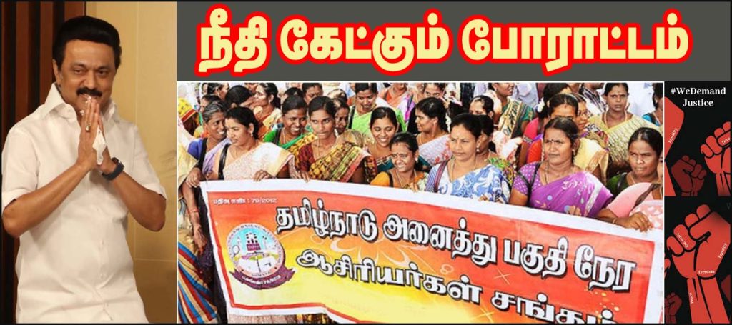 2021 ‘சட்டசபை தேர்தலின்போது பகுதிநேர ஆசிரியர்களை நிரத்தரம் செய்வோம் என வாக்குறுதியளித்து, இதுவரை நடவடிக்கை எடுக்காத முதல்வர் ஸ்டாலின் கவனத்தை   ஈர்க்கும் வகையில் நீதி கேட்கும் போராட்டம் நடத்தவுள்ளோம்’ என தமிழ்நாடு பகுதிநேர ஆசிரியர்கள் கூட்டமைப்பு தெரிவித்து உள்ளது.