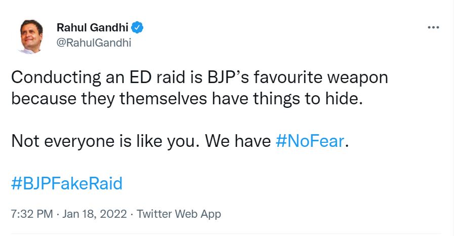 பஞ்சாப் முதல்வரின் உறவினர் வீட்டில் ரெய்டு செய்யப்பட்டது பாஜகவின் போலி ரெய்டு என்று காங்கிரஸ் தலைவர் ராகுல் காந்தி தெரிவித்துள்ளார்.