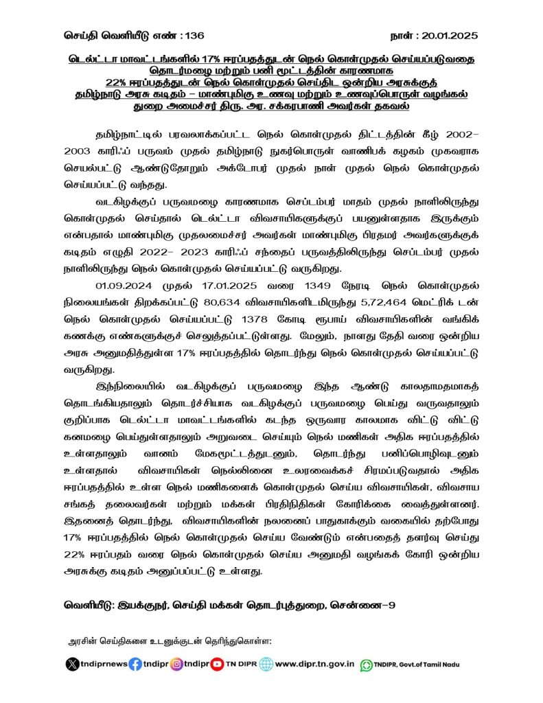 டெல்டா மாவட்டங்களில் 17% ஈரப்பதத்துடன் நெல் கொள்முதல் செய்யப்படும் நிலையில், தொடர்மழை மற்றும் பனி மூட்டத்தின் காரணமாக, 22% ஈரப்பதத்துடன் நெல் கொள்முதல் செய்திட உத்தரவிட வேண்டும் என மத்திய அரசுக்குத் தமிழ்நாடு அரசு கடிதம் எழுதி உள்ளதாக, உணவு மற்றும் உணவுப்பொருள் வழங்கல் துறை அமைச்சர் அர.சக்கரபாணி தெரிவித்துள்ளார்.