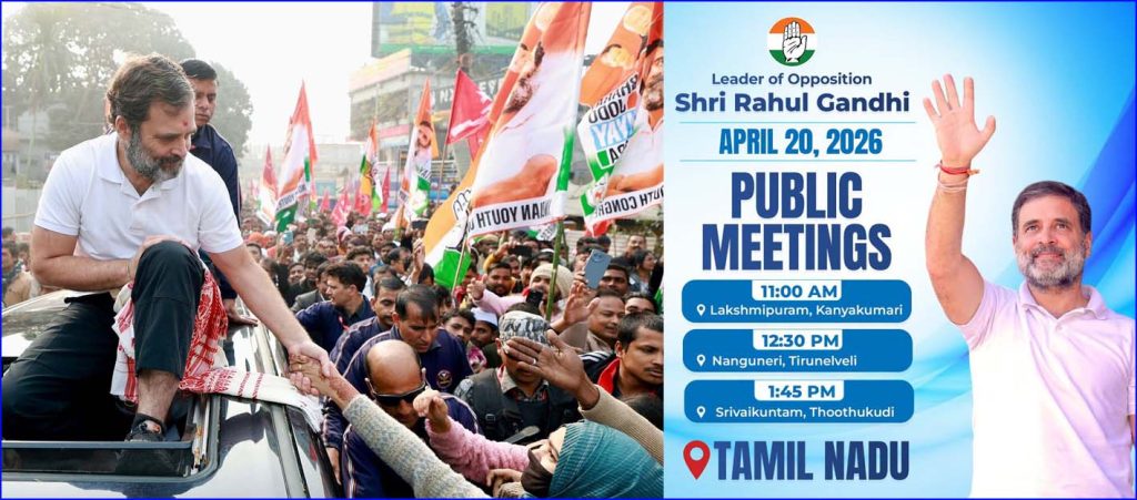 அதன்படி, இன்று  கன்னியாகுமரி – லட்சுமிபுரம், நெல்லை – நாங்குநேரி, தூத்துக்குடி – ஸ்ரீவைகுண்டம் ஆகிய பகுதிகளில் நடைபெறும் தேர்தல் பரப்புரை பொதுக்கூட்டங்களில் ராகுல் காந்தி பங்கேற்று உரையாற்றுகிறார்.