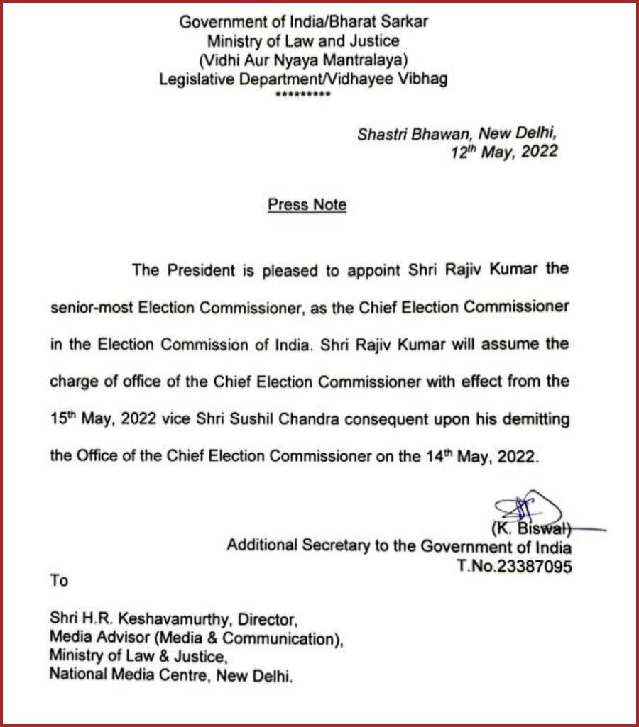 இதையடுத்து புதிய தேர்தல் ஆணையராக ராஜீவ்குமாரை குடியரசு தலைவர் நியமித்து உள்ளார். இவர் வரும் 15ந்தேதி தலைமை தேர்தல் ஆணையராக பதவி ஏற்க உள்ளார்.