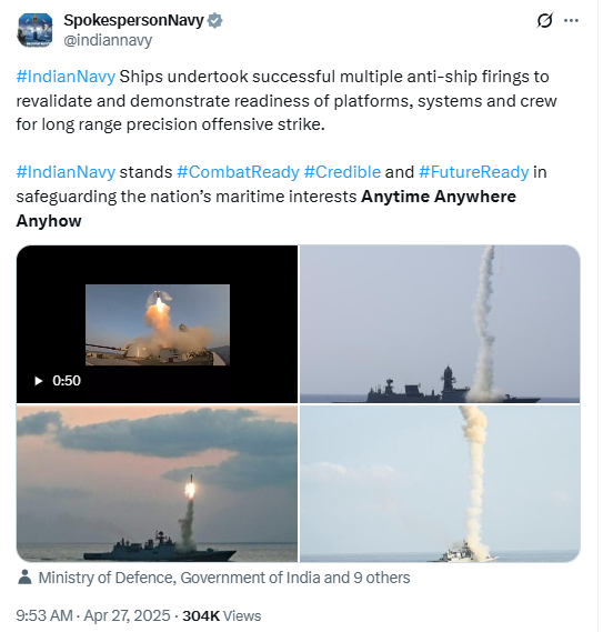 மேலும், “எந்த நேரத்திலும், எந்த இடத்திலும், எப்படியும் நாட்டின் கடல்சார் நலன்களைப் பாதுகாப்பதில் இந்திய கடற்படை போர் தயார், நம்பகமான மற்றும் எதிர்காலத் தயாராக உள்ளது” என்று இந்திய கடற்படை தனது எக்ஸ் பதிவில் குறிப்பிட்டுள்ளது.