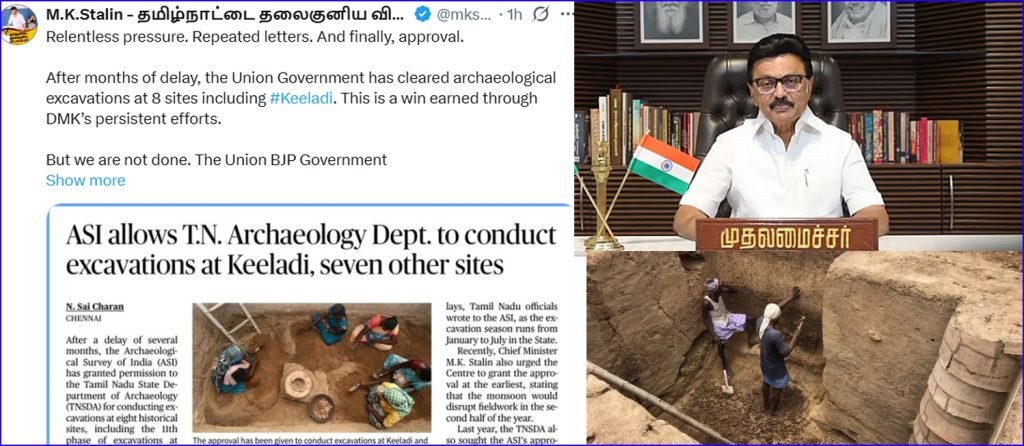 சென்னை: இடைவிடாத அழுத்தம். மீண்டும் மீண்டும் கடிதங்கள். இறுதியாக, ஒப்புதல்!  என  தமிழ்நாட்டின் 8 இடங்களில் அகழ்வாய்வுக்கு மத்தியஅரசு  அனுமதி  அளித்துள்ளது குறித்து முதல்வர் ஸ்டாலின் பதிவிட்டுள்ளார்.