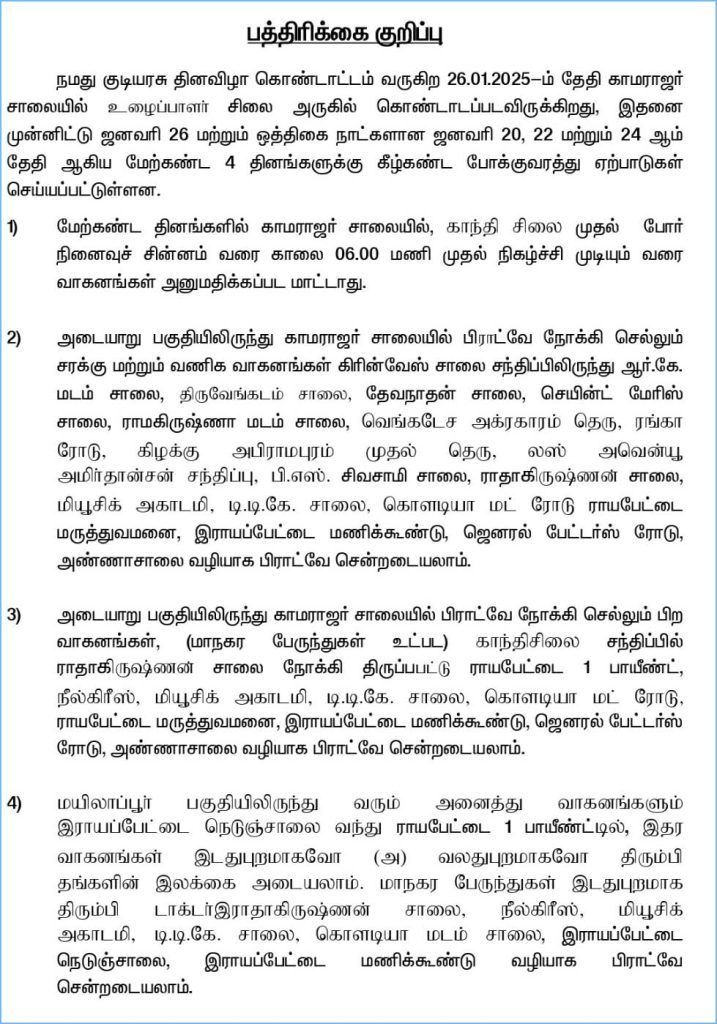 அதன்படி, ஜனவரி 20.01.2025, 22.01.2025, 24.01.2025 ஆகிய 4 தினங்களுக்கு போக்குவரத்து மாற்றம் செய்யப்படும் என அறிவிக்கப்பட்டு உள்ளது.