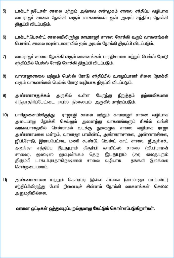 5) டாக்டர் நடேசன் சாலை மற்றும் அவ்வை சண்முகம் சாலை சந்திப்பு வழியாக காமராஜர் சாலை நோக்கி வரும் வாகனங்கள் ஐஸ் அவுஸ் சந்திப்பு நோக்கி திருப்பி விடப்படும்.