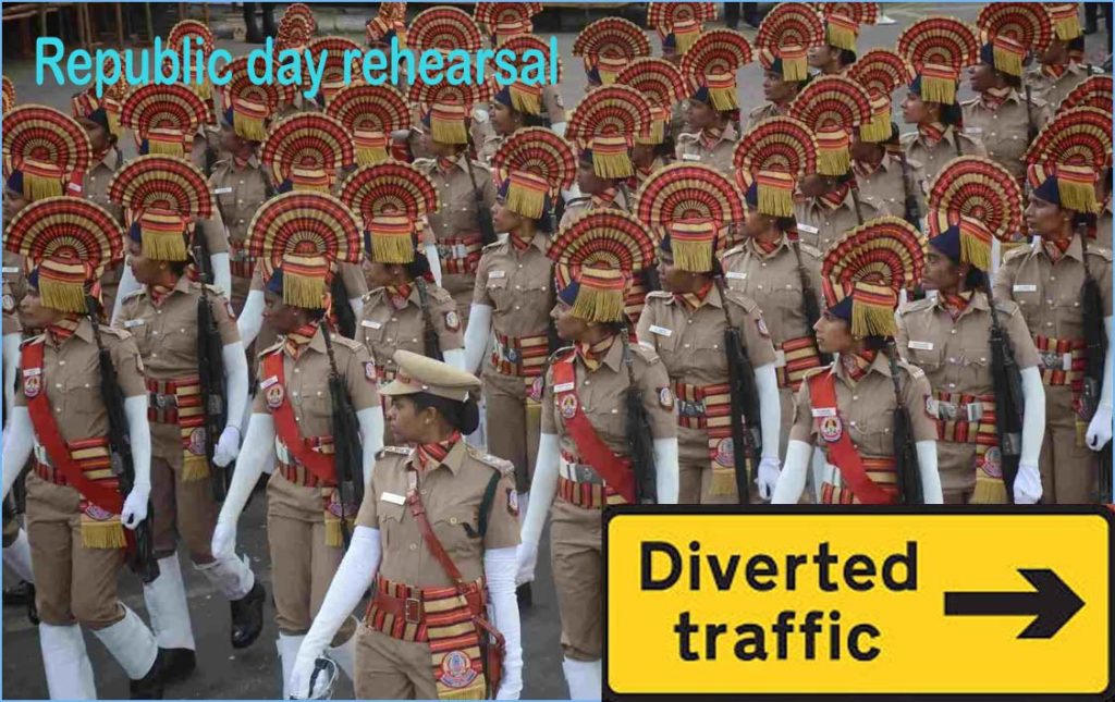 இதனை முன்னிட்டு ஒத்திகை நாட்களான ஜனவரி 20, 22 மற்றும் 24 ஆம் தேதி ஆகிய மேற்கண்ட 4 தினங்களுக்கு கீழ்கண்ட போக்குவரத்து ஏற்பாடுகள் செய்யப்பட்டுள்ளன. அதன் விவரத்தை போக்குவரத்து காவல்துறை வெளியிட்டு உள்ளது.