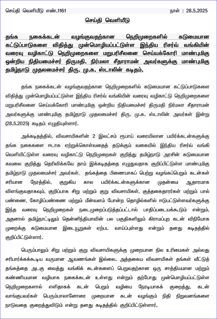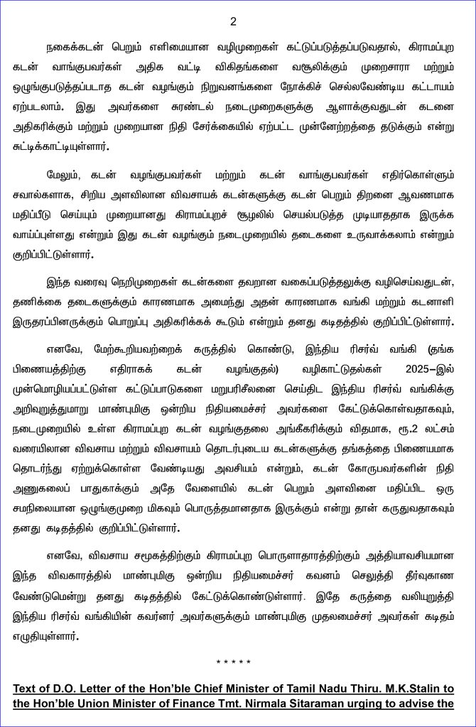 கடன் கோருபவர்களின் நிதி அணுகலை பாதுகாக்கும் அதே வேளையில் கடன் பெறும் அளவினை மதிப்பிட ஒரு சமநிலையான ஒழுங்குமுறை மிகவும் பொருத்தமானதாக இருக்கும் என்றுதான் கருதுகிறேன். எனவே, விவசாய சமூகத்திற்கும் கிராமப்புற பொருளாதாரத்திற்கும் அத்தியாவசியமான இந்த விவகாரத்தில் ஒன்றிய நிதியமைச்சர் கவனம் செலுத்தி தீர்வுகாண வேண்டும். இவ்வாறு முதல்வர் கடிதத்தில் கூறியுள்ளார். இதே கருத்தை வலியுறுத்தி இந்திய ரிசர்வ் வங்கியின் கவர்னருக்கும் முதல்வர் மு.க.ஸ்டாலின் கடிதம் எழுதியுள்ளார்.