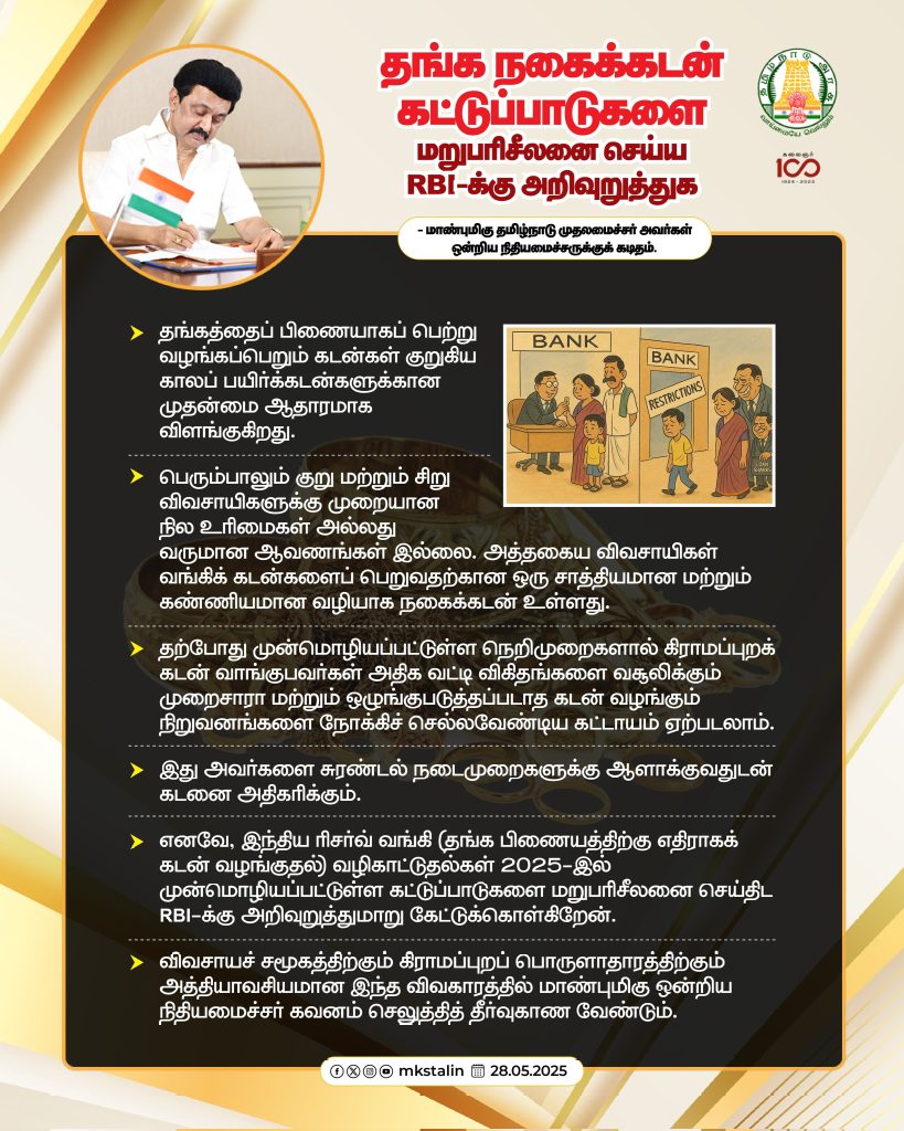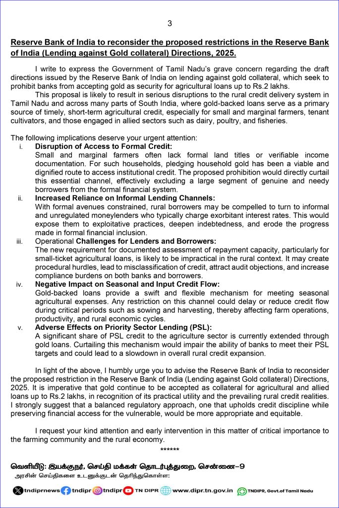 எனவே, மேற்கூறியவற்றை கருத்தில் கொண்டு, இந்திய ரிசர்வ் வங்கி (தங்க பிணையத்திற்கு எதிராக கடன் வழங்குதல்) வழிகாட்டுதல்கள் 2025-ல் முன்மொழியப்பட்டுள்ள கட்டுப்பாடுகளை மறுபரிசீலனை செய்ய இந்திய ரிசர்வ் வங்கிக்கு நிதி அமைச்சர் அறிவுறுத்த வேண்டும். நடைமுறையில் உள்ள கிராமப்புற கடன் வழங்குதலை அங்கீகரிக்கும் விதமாக, ரூ.2 லட்சம் வரையிலான விவசாய மற்றும் விவசாயம் தொடர்புடைய கடன்களுக்கு தங்கத்தை பிணையமாக தொடர்ந்து ஏற்றுக்கொள்ள வேண்டியது அவசியம்.