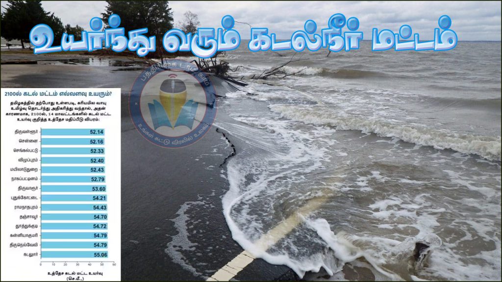 புவி வெப்பமாதல் கரியமில வாயு உமிழ்வு உள்பட பல்வேறு காரணங்களால் கடல் மட்டம் உயர்ந்து வருகிறது. இதனால், சென்னை உள்ளிட்ட ஏழு மாவட்டங்கள் பாதிக்கப்பட வாய்ப்புள்ளதாக ஆய்வுகள் தெரிவிக்கின்றன. மேலும் 2100ல் தமிழ்நாட்டின் சென்னை உள்பட கடலோர மாவட்டங்களில் கடல்நீர் மட்டம் எவ்வளவு உயரும் வாய்ப்பு உள்ளது என்ற பட்டியலையும் வெளியிட்டுள்ளது.