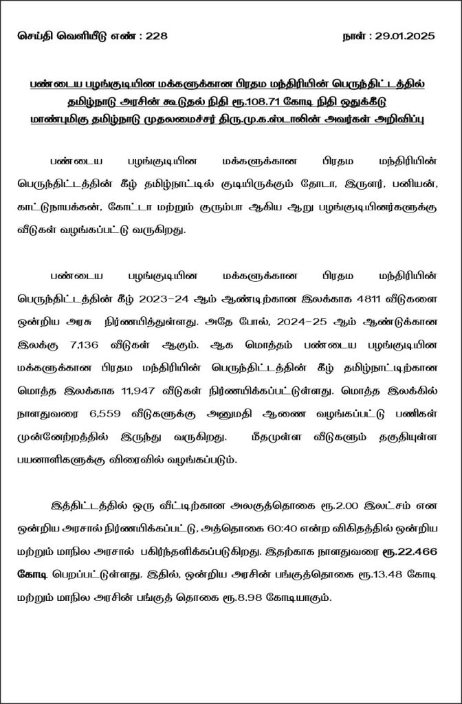 இந்த நிதி ஒதுக்கீடு “பண்டைய பழங்குடியின மக்களுக்கான பிரதம மந்திரியின் பெருந்திட்டத்தின்” கீழ் கட்டப்படும் வீடுகளை விரைந்து முடிக்க உதவிகரமாக இருக்கும். விரைவில் அனைத்து வீடுகளும் கட்டி முடிக்கப்பட்டு, மக்களின் பயன்பாட்டிற்கு கொண்டு வர தமிழ்நாடு அரசால் தீவிர நடவடிக்கைகள் மேற்கொள்ளப்பட்டு வருகிறது.