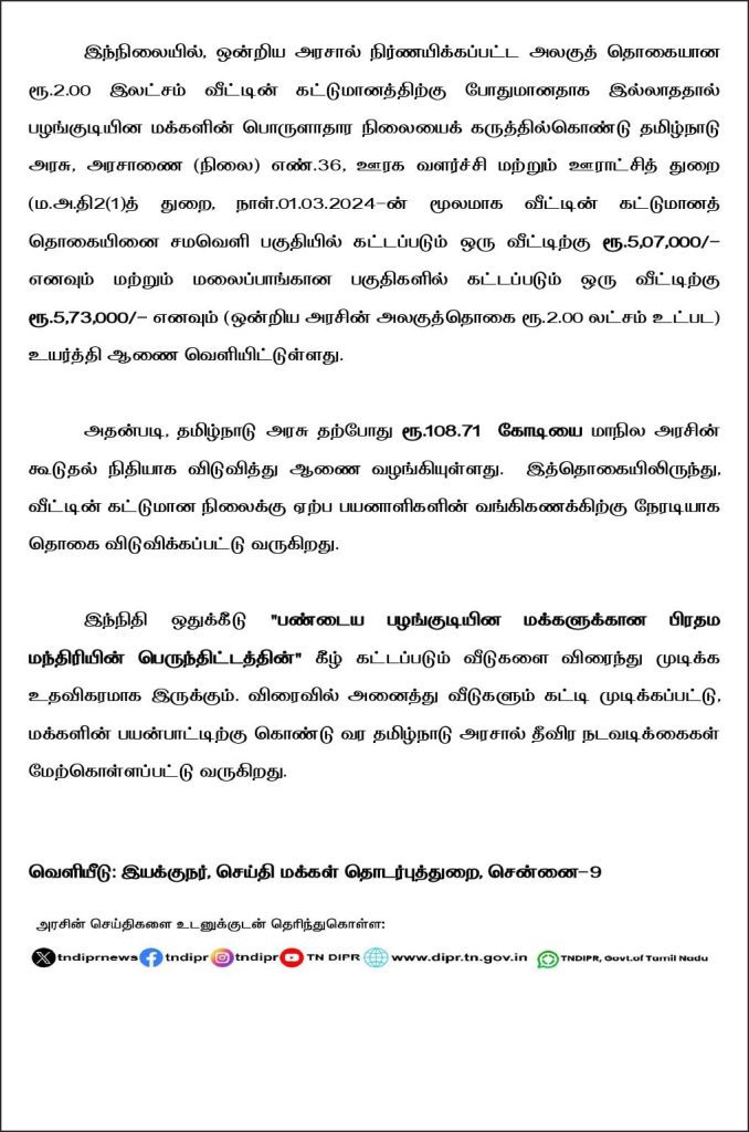 இந்த நிலையில், மத்திய அரசால் நிர்ணயிக்கப்பட்ட அலகுத் தொகையான ரூ.2.00 இலட்சம் வீட்டின் கட்டுமானத்திற்கு போதுமானதாக இல்லாததால் பழங்குடியின மக்களின் பொருளாதார நிலையைக் கருத்தில்கொண்டு தமிழ்நாடு அரசு, அரசாணை (நிலை) எண்.36, ஊரக வளர்ச்சி மற்றும் ஊராட்சித் துறை (ம.அ.தி2(1)த் துறை, நாள்.01.03.2024-ன் மூலமாக வீட்டின் கட்டுமானத் தொகையினை சமவெளி பகுதியில் கட்டப்படும் ஒரு வீட்டிற்கு ரூ.5,07,000/- எனவும் மற்றும் மலைப்பாங்கான பகுதிகளில் கட்டப்படும் ஒரு வீட்டிற்கு ரூ.5,73,000/- எனவும் (ஒன்றிய அரசின் அலகுத்தொகை ரூ.2.00 லட்சம் உட்பட) உயர்த்தி ஆணை வெளியிட்டுள்ளது.