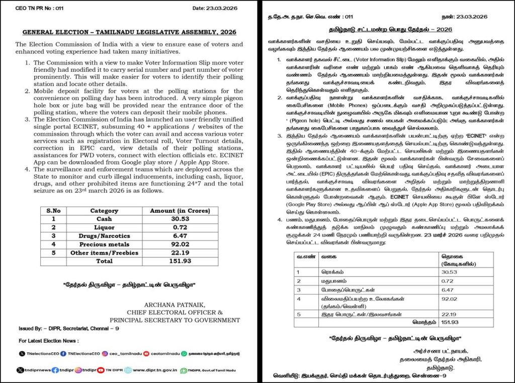 தமிழ்நாட்டில் சட்டமன்ற தேர்தலுக்கான அறிவிப்பு மார்ச் 15ந்தேதி மாலை வெளியிடப்பட்டது. இதையடுத்து தேர்தல் நடத்தை விதிகள் அமலுக்கு வந்தன. அதன்படி, அன்றுமுதல் 23ந்தேதி பிற்பகல் வரை தேர்தல் விதிமீறல்கள் தொடர்பாக ரூ.151.93 கோடி மதிப்புள்ள ரொக்க பணம் மற்றும் இலவச பொருட்கள் பறிமுதல் செய்யப்பட்டுள்ளதாக தமிழக தலைமை தேர்தல் அதிகாரி அர்ச்சனா பட்நாயக் கூறினார்.