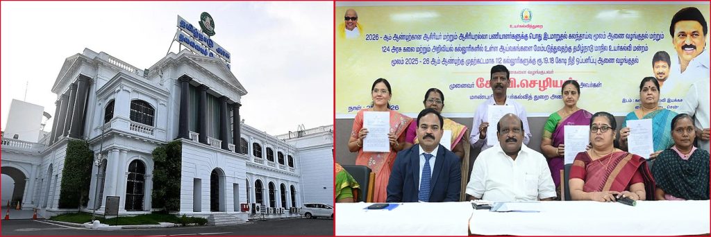 சென்னை, கல்லூரிக் கல்வி இயக்ககத்தில் 21.01.2026 அன்று  நடைபெற்ற நிகழ்ச்சியில் அமைச்சர் கோவி.செழியன்  112 அரசு கலை மற்றும் அறிவியல் கல்லூரிகளின் ஆய்வகங்களை மேம்படுத்துவதற்கு ரூ.19.18 கோடி நிதி ஒப்பளிப்புக்கான ஆணையினை வழங்கினார்.