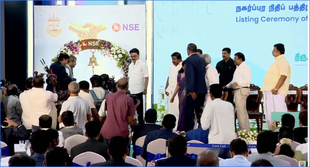 சென்னை மாநகராட்சியின் ரூ.200 கோடி மதிப்புள்ள நகர்புற நிதி பத்திரங்களை தேசிய பங்குச்சந்தையில் பட்டியலிடும் நிகழ்வினை மணி ஒலித்து தொடங்கிவைத்தார். சென்னை கலைவாணர் அரங்கத்தில் நகராட்சி நிர்வாகம் மற்றும் குடிநீர் வழங்கல் துறை மற்றும் பெருநகர சென்னை மாநகராட்சி தொடர்பான நிதிபத்திரங்கள் தேசிய பங்குச்சந்தையில் பட்டியலிடக்கூடிய நிகழ்வானது நடைபெற்றது. தமிழ்நாடு அரசு நிதி ஆதாராங்களை திரட்டி பல்வேறு திட்டங்களை செயல்படுத்திவருகிறது.