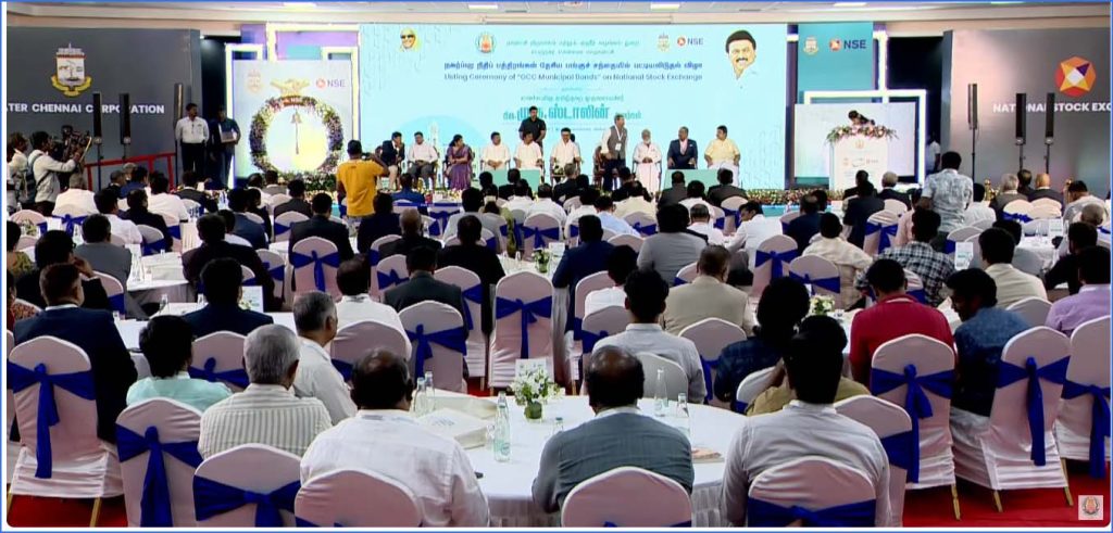 சென்னை, கலைவாணர் அரங்கில் இன்று திங்கட்கிழமை காலை 10.15 மணியளவில் நகராட்சி நிருவாகம் மற்றும் குடிநீர் வழங்கல் துறை மற்றும் பெருநகர சென்னை மாநகராட்சி சார்பில் நடைபெறும் நகர்ப்புர நிதிப் பத்திரங்கள் தேசிய பங்குச் சந்தையில் பட்டியலிடுதல் விழாவில் (Listing Ceremony of “GCC Municipal Bonds” on National Stock Exchange) பெருநகர சென்னை மாநகராட்சியின் 200 கோடி ரூபாய் மதிப்புள்ள நகர்ப்புர நிதிப்பத்திரங்களை தேசிய பங்குச் சந்தையில் பட்டியலிடும் நிகழ்வினை, மணி ஒலித்து தொடங்கி வைத்தார்.