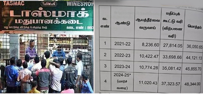 டாஸ்மாக் விற்பனை, 2021 – 2022ம் நிதியாண்டில் ரூ. 36,050 கோடியும், 2022 – 2023ம் நிதியாண்டில் ரூ.44,121 கோடியும், 2023 – 2024ம் நிதியாண்டில் ரூ.45,855 கோடியும், 2024 – 2025ம் நிதியாண்டில் ரூ.48,344 கோடியும் வருவாய் கிடைத்துள்ளது.