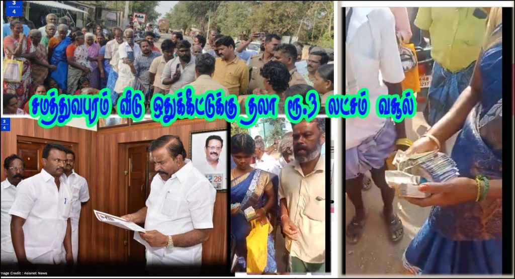 திருச்சி மாவட் டம், துறையூர் அருகே மங்கம்பட்டி, தளுகை, சேலம் மாவட்டம், தம்மம்பட்டி அருகே தண்ணீர் பந்தல் ஆகிய இடங்களில் மிகப்பெரிய அளவில் சமத்துவபுரம் திட்டத்தின் கீழ் 140 வீடுகள் கட்டி தயாராக உள்ளன. இதில் ஒரு வீடு ஒதுக்குவதற்கு என 100 வீடுகளுக்கும் தலா ரூ.3 லட்சம் வசூல் வேட்டை நடைபெற்று வருகிறது என திமுக ஒன்றிய செயலாளர்கள் மீது குற்றச்சாட்டு எழுந்துள்ளது.