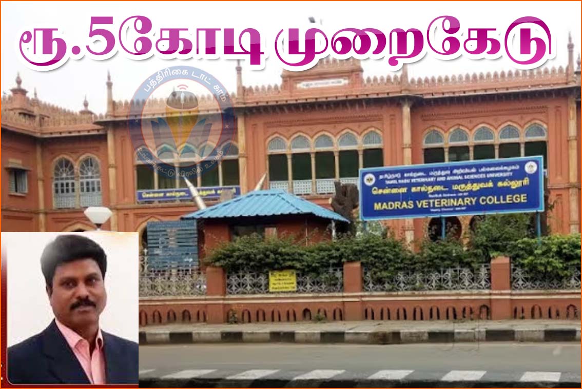 சென்னை வேப்பேரி கால்நடை மருத்துவ பல்கலைக்கழகத்தில் சமீபத்தில் கணக்கு குழுவினர் ஆய்வு மேற்கொண்டனர்.  இதில் ரூ. 5 கோடி வரையில் முறைகேடு நடந்துள்ளது தெரிய வந்துள்ளது. பல்வேறு செலவினங்களில் முறைகேடு நடந்துள்ளதைக் கணக்கு குழுவினர்க் கண்டறிந்தனர். இந்த  சம்பவம் மாணவ, மாணவிகள் மற்றும் பேராசிரியர்கள் மத்தியில் அதிர்ச்சியை ஏற்படுத்தியுள்ளது.