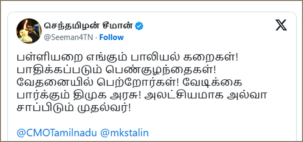 திமுக ஆட்சியில் பள்ளிக்குழந்தைகள் முதல் பல்கலைக்கழக மாணவி வரை பாலியல் வன்கொடுமைக்கு ஆளாக்கப்படும் கொடுமைகள் வார்த்தைகளால் சொல்லிமாளக்கூடியதல்ல என சீமான் கடும் கண்டனத்தை பதிவு செய்துள்ளார்.