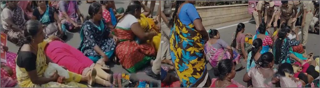 சென்னை மெரினாவில் பல்வேறு கோரிக்கைகளை வலியுறுத்தி தூய்மைப் பணியாளர்கள் கண்ணீர் மல்க போராட்டம் போராட்டத்தில் ஈடுபட்டனர். தகவலறிந்து சம்பவ இடத்திற்கு வந்த போலீசார் போராட்டத்தில் ஈடுபட்ட தூய்மைப் பணியாளர்களுடன் பேச்சுவார்த்தை நடத்தினர். இருப்பினும் அவர்கள் தொடர்ந்து போராட்டத்தில் ஈடுபட்டனர். காவல்துறையினர் குண்டுக்கட்டாக கைது செய்தனர். அப்போது பெண்கள் பலர் கண்ணீர் விட்டு கதறினர். எங்கள கொல பண்ண சொல்லுங்க; செத்து போறோம்.. பசியோடு இருக்க முடியாது” என்று கதறினர். ஆனால், காவல்துறையினர் அதை கண்டுகொள்ளாமல், அவர்களை இழுத்துச்சென்று பேருந்தில் ஏற்றி அழைத்து சென்று அருகில் உள்ள மண்டபத்தில் தங்க வைத்துள்ளனர்.