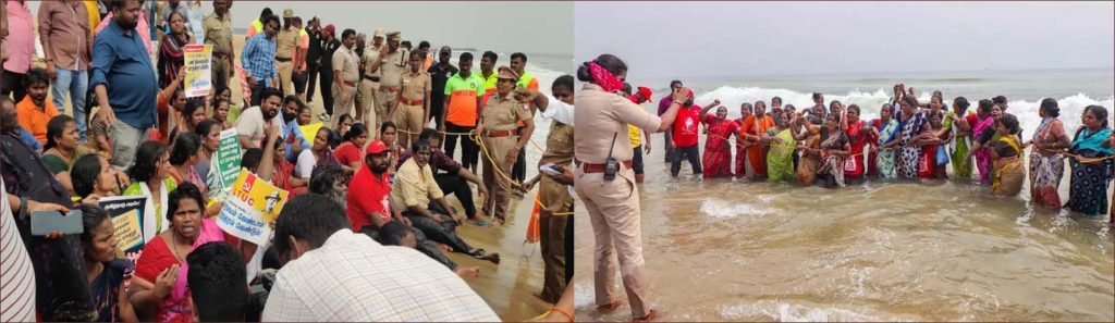 தமிழக முதல்வர் தேர்தல் வாக்குறுதி எண் 153 மற்றும் 285 படி பணி நிரந்தரம் என்ற கோரிக்கையை நிறைவேற்ற வேண்டும் உள்பட பல்வேறு கோரிக்கைகளை வலியுறுத்தி தூய்மைப் பணியாளர்கள் கடலில் இறங்கி போராட்டத்தில் ஈடுபட்டனர்.