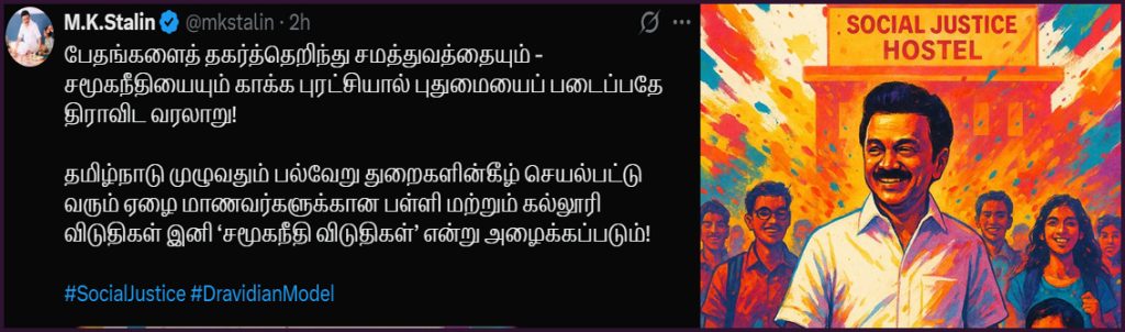 தமிழ்நாடு முழுவதும் பல்வேறு துறைகளின் கீழ் செயல்பட்டு வரும் ஏழை மாணவர்களுக்கான பள்ளி மற்றும் கல்லூரி விடுதிகள் இனி ‘சமூகநீதி விடுதிகள்’ என்று அழைக்கப்படும்”!