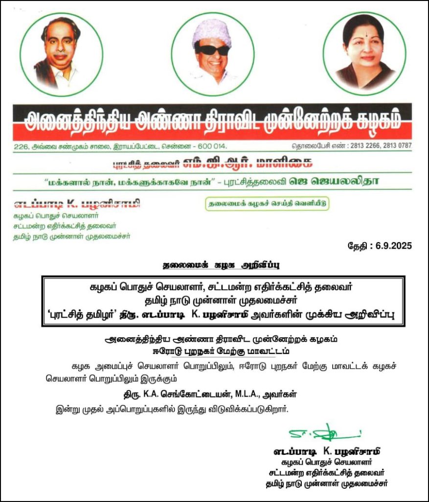 இது தொடர்பாக எடப்பாடி பழனிசாமி வெளியிட்டுள்ள அறிக்கையில், “அனைத்திந்திய அண்ணா திராவிட முன்னேற்றக் கழகம் ஈரோடு புறநகர் மேற்கு மாவட்டம் கழக அமைப்புச் செயலாளர் பொறுப்பிலும், ஈரோடு புறநகர் மேற்கு மாவட்டக் கழகச் செயலாளர் பொறுப்பிலும் இருக்கும் கே.ஏ. செங்கோட்டையன், எம்.எல்.ஏ. இன்று முதல் அப்பொறுப்புகளில் இருந்து விடுவிக்கப்படுகிறார்”.