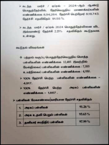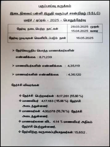 தமிழகத்தில் 10ம் வகுப்பு பொதுத்தேர்வுகள் கடந்த மார்ச்  28-ஆம் தேதி முதல் ஏப்ரல் 15 வரை நடைபெற்றன. இந்தத் தேர்வுகள் தமிழ்நாடு மற்றும் புதுச்சேரியில் மொத்தம் 4,107 தேர்வு மையங்களில் நடத்தப்பட்டன. இதில் சுமார் 9.10 லட்சம் மாணவ-மாணவிகள் பங்கேற்றனர். இவர்களில் 4,57,525 ஆண்களும், 4,52,498 பெண்களும், ஒரு மாற்றுப் பாலினத்தவரும் அடங்குவர். மேலும், 28,827 தனித்தேர்வர்களும் இந்தத் தேர்வை எழுதினர்.