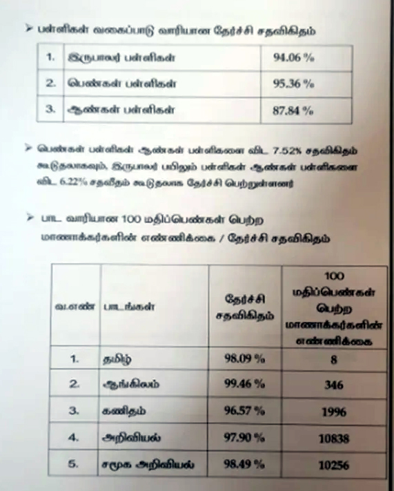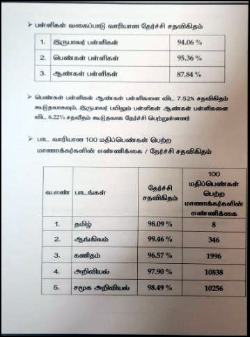 அதன்படி தேர்வு எழுதியவர்களில்,  8,17,261 பேர் தேர்ச்சி பெற்றுள்ளனர். அதன்படி தேர்ச்சி விகிதம் – 93.80 சதவீதம் ஆகும். 10ம் வகுப்பில் மாணவியர் 4,17,183 (95.88 சதவீதம்) தேர்ச்சி அடைந்துள்ளனர். மாணவர்கள் 4,00.078 (91.74 சதவீதம்) தேர்ச்சி அடைந்துள்ளனர். இதனால் இந்த ஆண்டு மாணவியர் தேர்ச்சி விகிதம் 4.14 சதவீதம் அதிகரித்துள்ளது. தேர்விற்கு வருகைபுரியாதவர்கள்: 15,652பேர் ஆகும். 10ம் வகுப்பு பொதுத் தேர்வில் 98.31 சதவீதம் தேர்ச்சியுடன் சிவகங்கை மாவட்டம் முதலிடம் பிடித்துள்ளது.