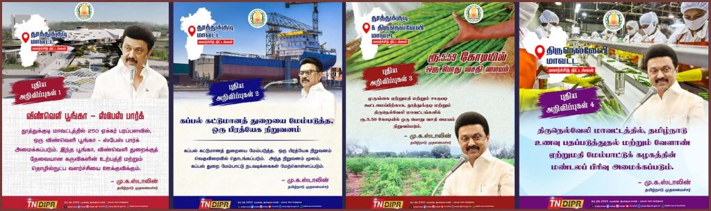 தூத்துக்குடியை தொழிற்வளர்ச்சி மிக்க மாவட்டமாக வளர்த்து எடுக்கிறார். சொன்னதை செய்வோம் என்பதுதான் நமது அரசின் குறிக்கோள் என தெரிவித்ததுடன், முaynes Circuit india நிறுவனம். தேனி மாவட்டத்தில் ரூ.1,500 கோடி முதலீட்டில் சூரிய சக்தி மின் தகடு உற்பத்தி செய்யும் ஆலை அமைகிறது. டெல்லியைச் சேர்ந்த மோபியஸ் எனர்ஜி நிறுவனம் ரூ.1,500 கோடியில் ஆலையை அமைக்கிறது என்றவர், 2030க்குள் ஒரு டிரில்லியன் டாலர் பொருளாதாரமாக தமிழ்நாட்டை மாற்றுவோம் என உறுதி அளித்தார்.