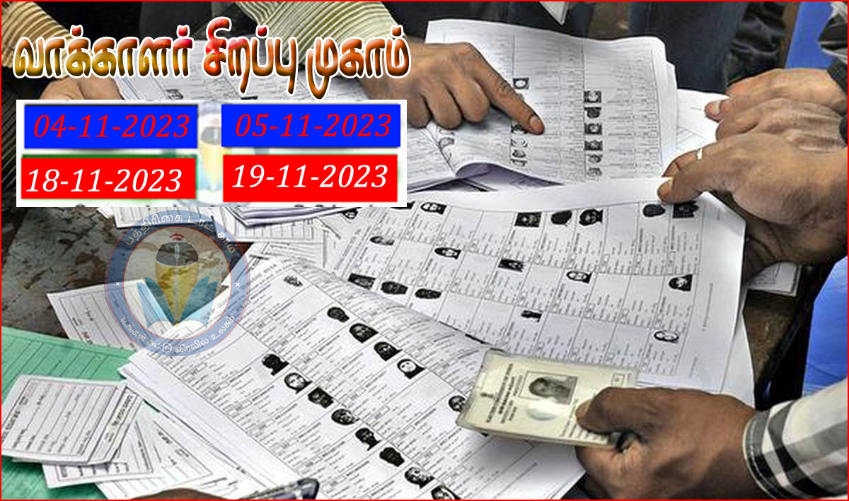 இதையொட்டி, தமிழகத்தில் அனைத்து வாக்குச்சாவடிகளிலும் அக்டோபர் 27ந்தேதி வரைவு வாக்காளர் பட்டியல் வெளியிடப்பட்டது. தொடர்ந்து, நவம்பர் மாதத்தில் 4 நாட்கள் வாக்காளர் பட்டியலில் பெயர் சேர்த்தல், நீக்குதல், திருத்தம் செய்தலுக்கான சிறப்பு முகாம் நடைபெறும் என அறிவிக்கப்பட்டு உள்ளது.