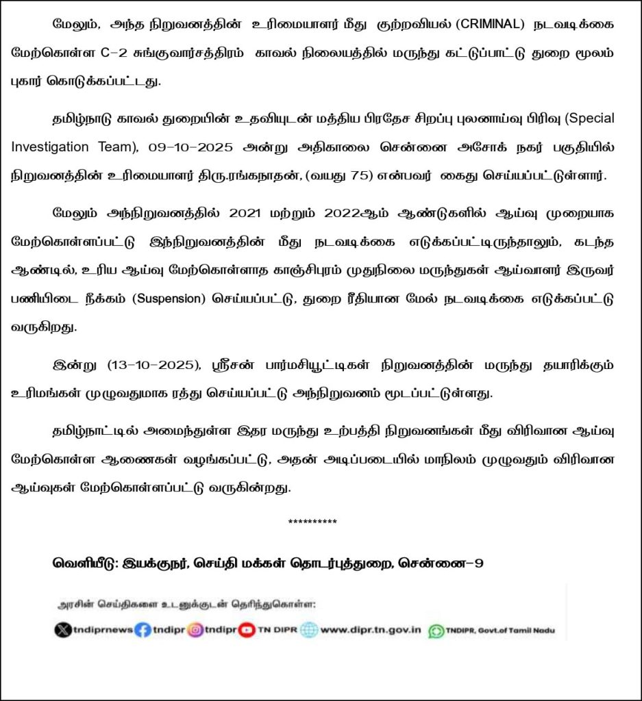 இதைத்தொர்ந்து,  22 குழந்தைகளைக் கொன்றதாகக் கூறப்படும் ‘கோல்ட்ரிப்’ (Coldrip) இருமல் மருந்தைத் தயாரித்த ஸ்ரீசன் பார்மசூட்டிகல்ஸ் (Srisan Pharmaceuticals) நிறுவனத்தின் உரிமம் முழுவதுமாக ரத்து செய்யப்பட்டு, அந்த ஆலை இழுத்து மூடப்பட்டுள்ளது  தமிழக சுகாதாரத் துறை வெளியிட்டுள்ளது. மேலும், தமிழ்நாட்டில் உள்ள மற்ற மருந்து உற்பத்தி நிறுவனங்கள் அனைத்தின் மீதும் விரிவான ஆய்வை மேற்கொள்ளவும் சுகாதாரத் துறை உத்தரவிட்டுள்ளது.