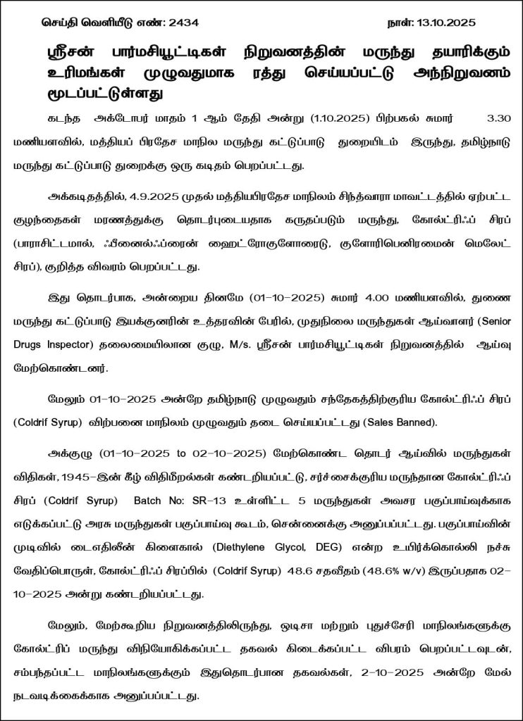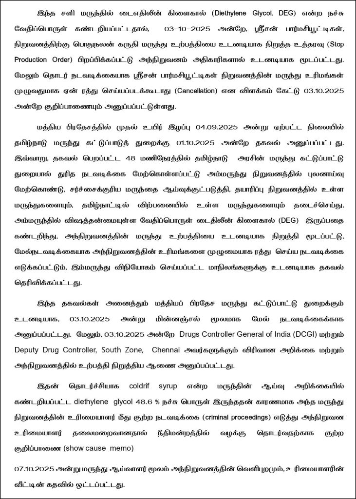 இதைத்தொர்ந்து,  22 குழந்தைகளைக் கொன்றதாகக் கூறப்படும் ‘கோல்ட்ரிப்’ (Coldrip) இருமல் மருந்தைத் தயாரித்த ஸ்ரீசன் பார்மசூட்டிகல்ஸ் (Srisan Pharmaceuticals) நிறுவனத்தின் உரிமம் முழுவதுமாக ரத்து செய்யப்பட்டு, அந்த ஆலை இழுத்து மூடப்பட்டுள்ளது  தமிழக சுகாதாரத் துறை வெளியிட்டுள்ளது. மேலும், தமிழ்நாட்டில் உள்ள மற்ற மருந்து உற்பத்தி நிறுவனங்கள் அனைத்தின் மீதும் விரிவான ஆய்வை மேற்கொள்ளவும் சுகாதாரத் துறை உத்தரவிட்டுள்ளது.