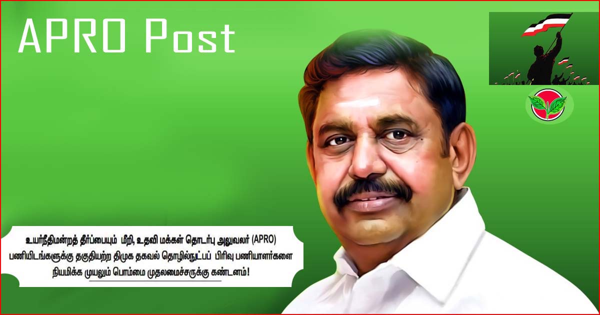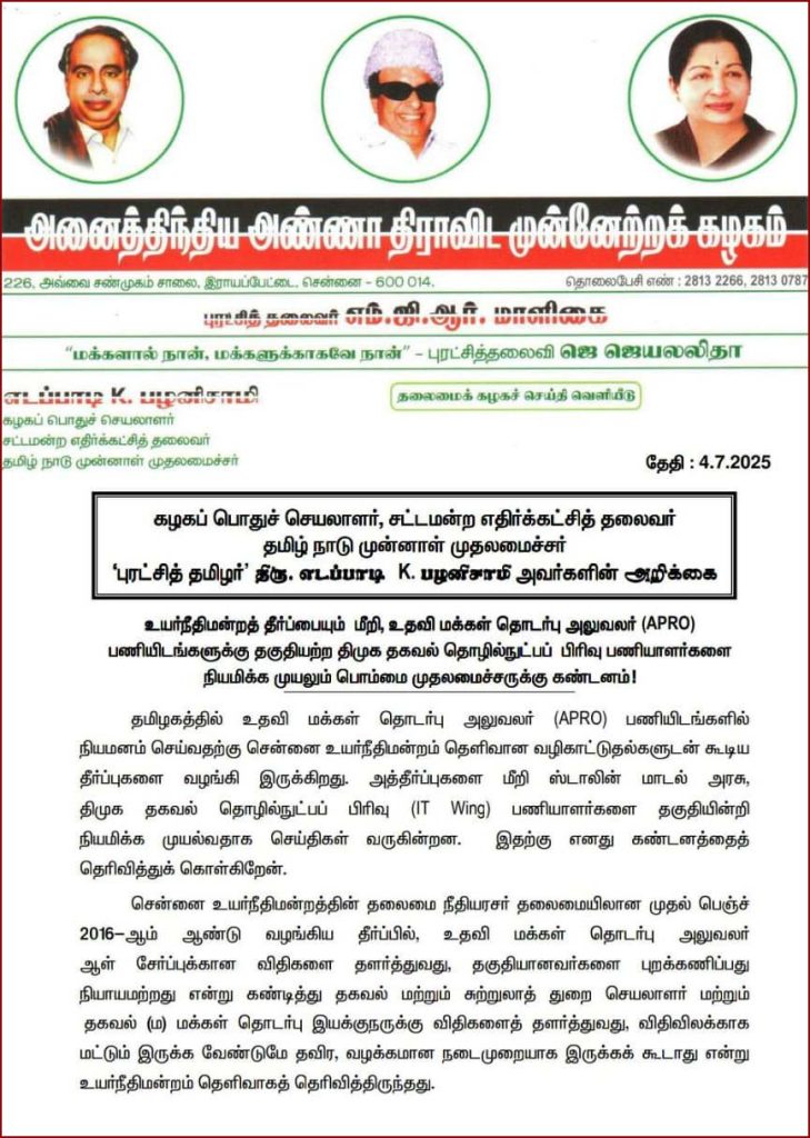 இதுதொடர்பாக அதிமுக பொதுச்செயலாளர் எடப்பாடி பழனிசாமி, தமிழ்நாட்டில் உதவி மக்கள் தொடர்பு அலுவலர் (APRO) பணியிடங்களில் நியமனம் செய்வதற்கு சென்னை உயர்நீதிமன்றம்,  தெளிவான வழிகாட்டுதல்களுடன் கூடிய தீர்ப்புகளை வழங்கி இருக்கிறது. அத்தீர்ப்புகளை மீறி ஸ்டாலின் மாடல் அரசு, திமுக தகவல் தொழில்நுட்பப் பிரிவு பணியாளர்களை தகுதியின்றி நியமிக்க முயல்வதாக செய்திகள் வருகின்றன என  எடப்பாடி பழனிசாமி  குற்றம் சாட்டி உள்ளார்.