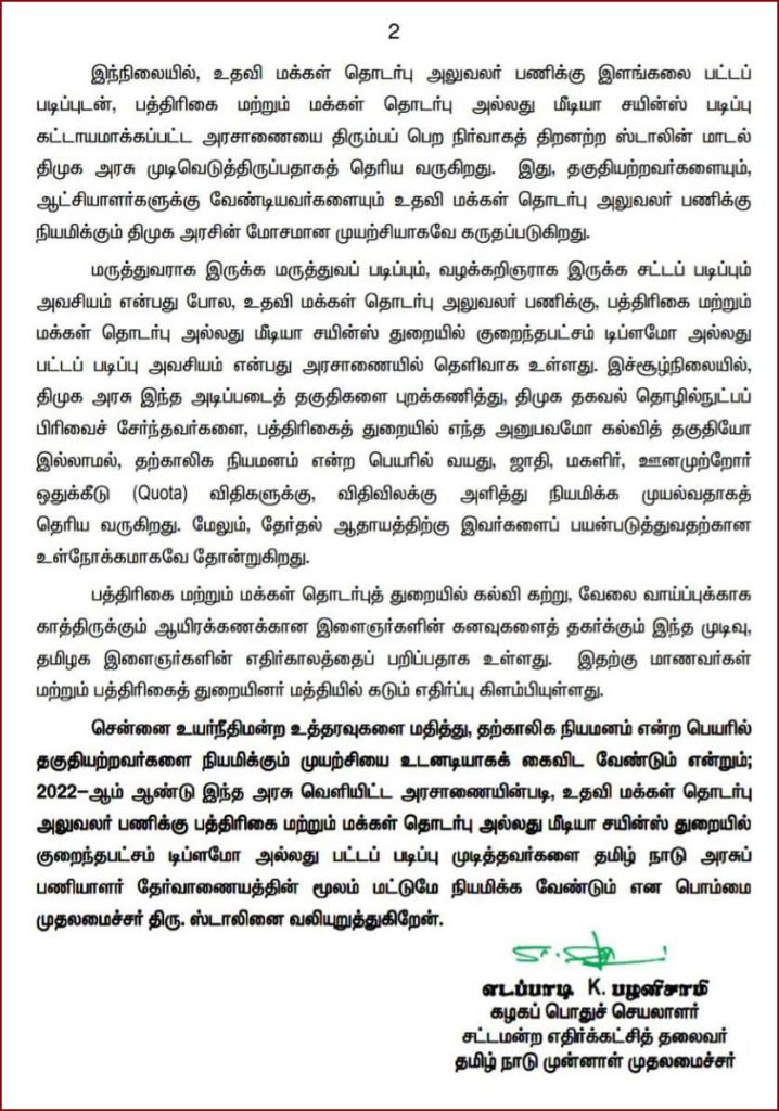 சென்னை ஐகோர்ட்டு உத்தரவுகளை மதித்து, தற்காலிக நியமனம் என்ற பெயரில் தகுதியற்றவர்களை நியமிக்கும் முயற்சியை உடனடியாகக் கைவிட வேண்டும் என்றும், 2022ஆம் ஆண்டு இந்த அரசு வெளியிட்ட அரசாணையின்படி, உதவி மக்கள் தொடர்பு அலுவலர் பணிக்கு பத்திரிகை மற்றும் மக்கள் தொடர்பு அல்லது மீடியா சயின்ஸ் துறையில் குறைந்தபட்சம் டிப்ளமோ அல்லது பட்டப் படிப்பு முடித்தவர்களை தமிழ்நாடு அரசுப் பணியாளர் தேர்வாணையத்தின் மூலம் மட்டுமே நியமிக்க வேண்டும்.