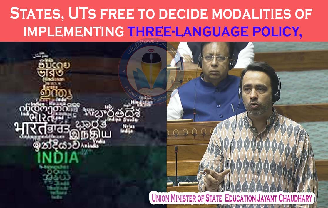 இந்த கேள்விக்கு பதில் கூறிய மத்திய கல்வித் துறை இணை அமைச்சர் ஜெயந்த் சவுத்ரி, மும்மொழிக் கொள்கையை செயல்படுத்துவதற்கான வழிமுறைகளை மாநிலங்கள், யூனியன் பிரதேசங்கள் சுதந்திரமாக முடிவு செய்யலாம் என்று மத்திய கல்வி இணை அமைச்சர் ஜெயந்த் சவுத்ரி தெரிவித்துள்ளார்.