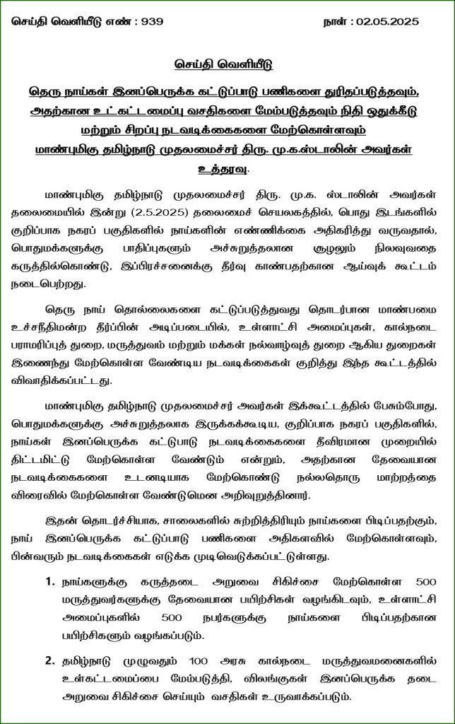 முதல்வர் ஸ்டாலின் தலைமையில் இன்று (2.5.2025) சென்னை தலைமைச் செயலகத்தில், நகரப் பகுதிகளில் நாய்களின் எண்ணிக்கை அதிகரித்து வருவதால், பொதுமக்களுக்கு பாதிப்புகளும் அச்சுறுத்தலான சூழலும் நிலவுவதை கருத்தில்கொண்டு, இப்பிரச்சனைக்கு தீர்வு காண்பதற்கான ஆய்வுக் கூட்டம் நடைபெற்றது.