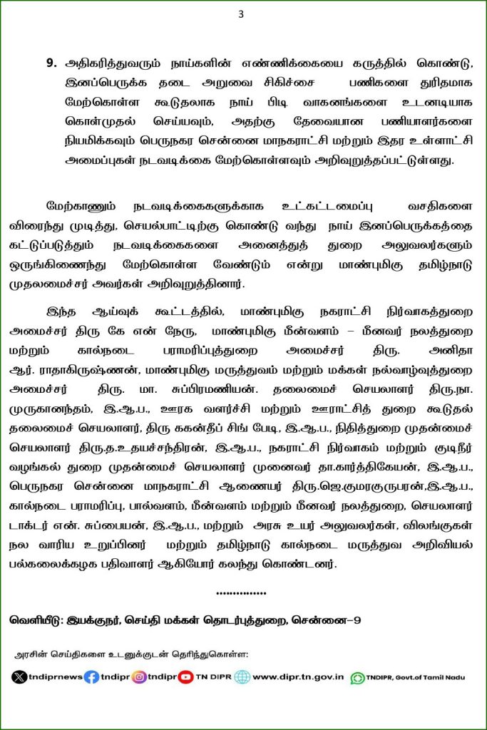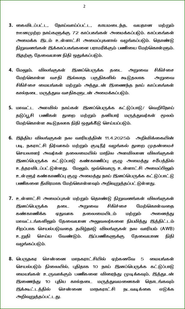 பெருநகர சென்னை மாநகராட்சியில் ஏற்கனவே 5 மையங்கள் செயல்படும் நிலையில், புதிதாக 10 நாய் இனப்பெருக்க கட்டுப்பாடு மையங்கள் உருவாக்கும் பணிகளை விரைந்து முடிக்கவும், இத்துடன் இணைந்து 10 புதிய கால்நடை மருத்துவமனைகள் தொடங்கவும் இக்கூட்டத்தில் சென்னை மாநகராட்சி நடவடிக்கை எடுக்க அறிவுறுத்தப்பட்டது.