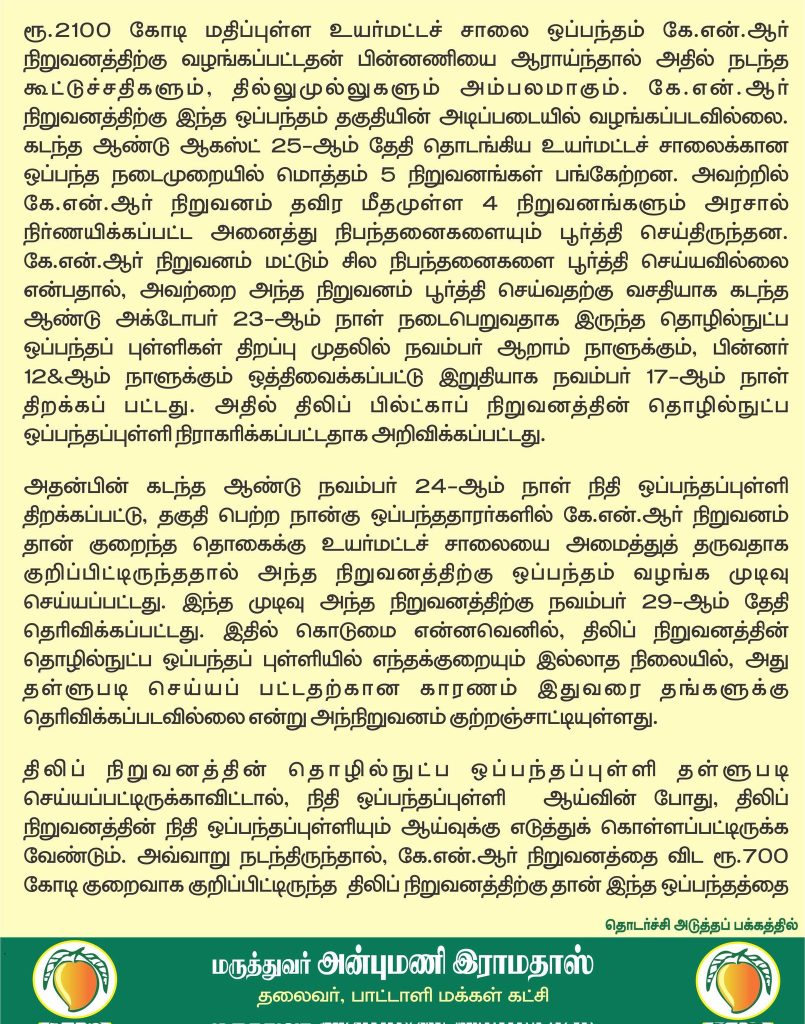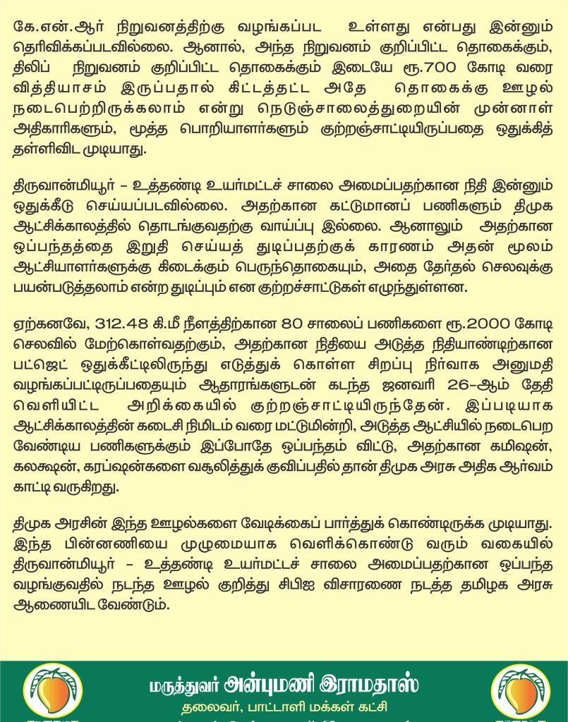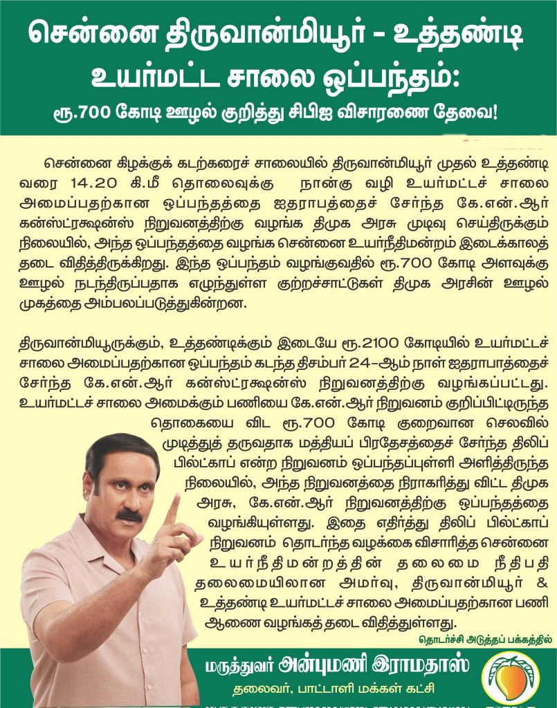 மற்றொரு அறிக்கையில், : சென்னை கிழக்கு கடற்கரை சாலையில் திருவான்மியர்-உத்தண்டி இடையே ரூ.2,100 கோடியில் உயர்மட்டச்சாலை அமைப்பதற்கான ஒப்பந்தம் கடந்த டிச.24-ம் தேதி ஐதராபாத்தை சேர்ந்த கேஎன்ஆர் கன்ஸ்ட்ரக்ஷன்ஸ் நிறுவனத்துக்கு வழங்கப்பட்டது.